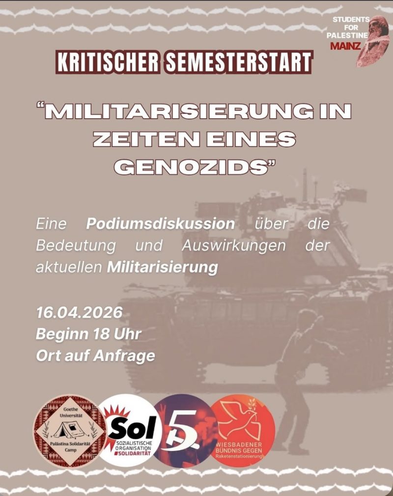 Im Rahmen des kritischen Semesterstarts veranstalten wir aus diesem Grund gemeinsam mit der @solmainz, @students4palestine_ffm, @arbeiterinnenmacht und @wiesbadener.buendnis eine Podiumsdiskussion zum Thema „Militarisierung in Zeiten eines Genozids“.